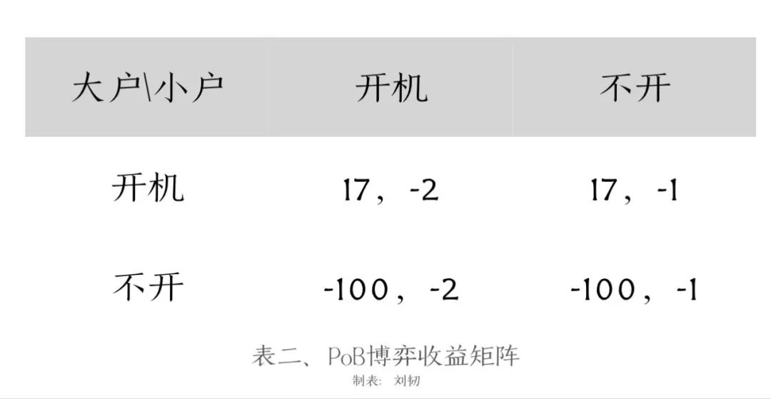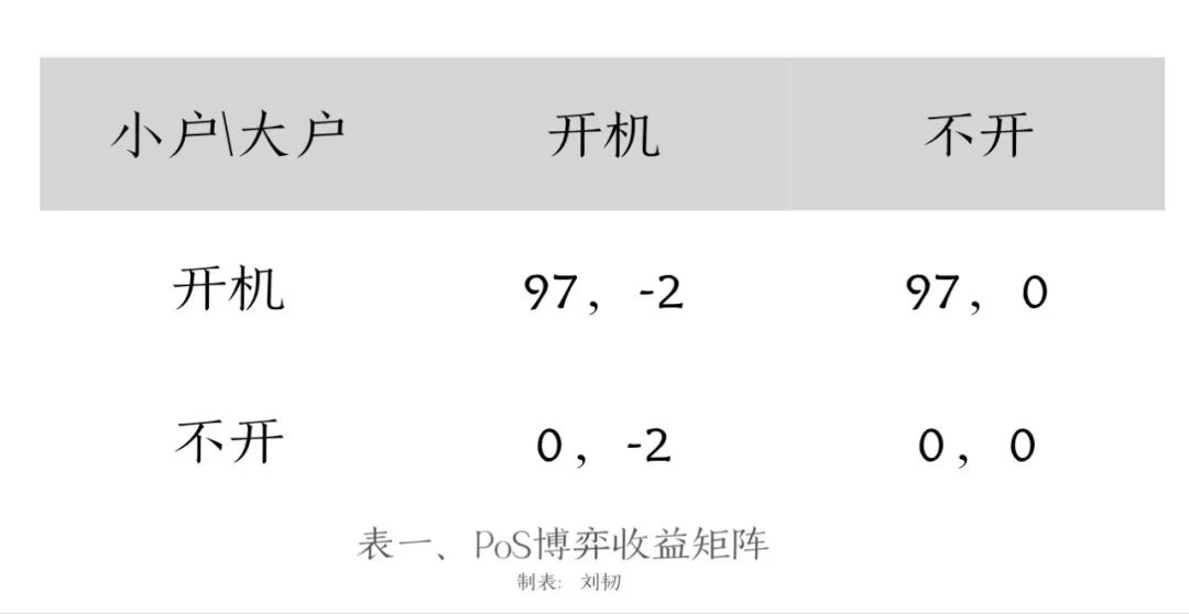 Sunny King在此犯的错误是,在PoS模式下,人人挖矿不可持续,它势必跌入一个赢家通吃的黑洞之中。假设电力成本均为3币,大户持有10000币天获得100个利息币,小户持有100币天,获得1利息币,大户得到的币会比小户多得多,如此以来,小户将倾向于关掉客户端,大户则倾向于囤积币天,并获得更多的利息币,这是一个致命的均衡(表一)。
