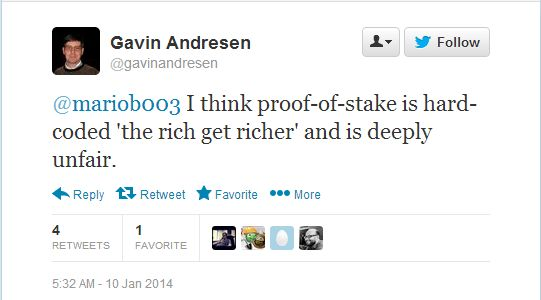 对此,比特币基金会首席科学家Gavin Andresen一语中的,他在twitter表示:“PoS是一个硬编码系统,而且相当不公平,只会导致富者愈富(图2)。”PoS的支持者辩解道,“在比特币系统中,有钱人可以在挖矿设备上投入更多,从而在挖矿时得到更多的比特币,有什么不同呢?这难道不是富者愈富一样的道理吗?”
