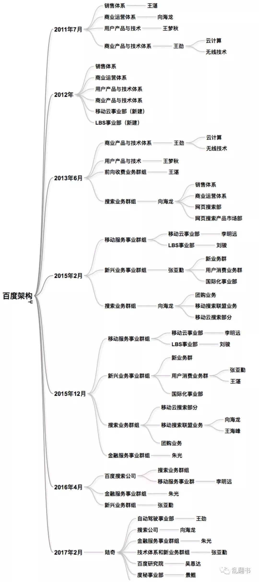 更大的节点是13年PC搜索走向低增长开始向移动切换的时候。13年负责用户产品和技术体系的王梦秋离职,王梦秋走后大搜团队多位总监也选择了出走,比如今天头条技术副总裁杨震原和曾担任头条技术顾问的廖若雪。再后赶上创业潮兴起和VC/老同事的怂恿,AI/无人车市场哪家还没几个百度的核心技术。