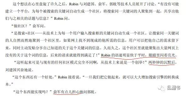 至于《壹百度》,基本照着完美神化的路子去了。豆瓣图书介绍第一句是“让职场新人迅速成长为企业核心,帮企业发现跨越式发展的核心秘密”。里面有提到李彦宏如何给李明远发最高奖的惊喜,如何从善如流让百度的聊天软件叫了百度HI,但是全书都没有对任何一个产品失败的反思。这本书里关于场景的还原和高管的心理活动描写非常有意思,比如为什么会有贴吧这个产品产生,俞军被称为贴吧之父完全是浪得虚名,这一切都是因为在Robin的光环照耀下: