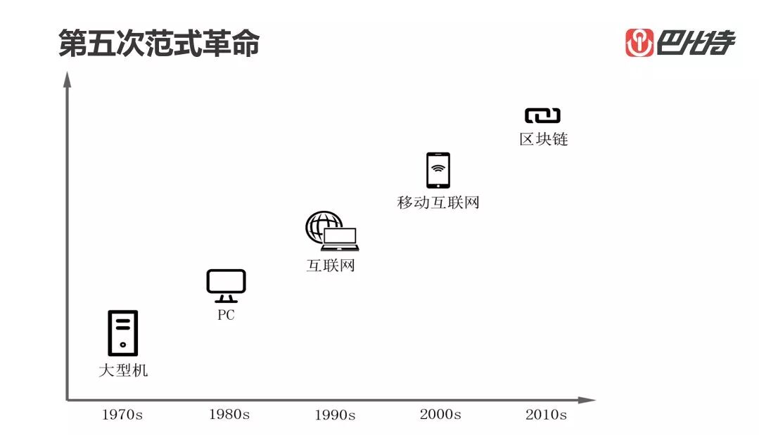 很多人把区块链理解为第五次范式革命,因为它基于过去几十年对技术更新的总结,大概就是每两年就会完成这样一种范式革命,跳跃式的革命。70年代就是大型机,80年代就是PC,90年代就是互联网,00年代就是移动互联网,10年代区块链诞生了。这背后的趋势其实是一种去中心化的趋势,大型机都是在科研院所或者是军事机构,PC走入家庭,互联网更加是走入千千万万的人群,移动互联网更是弥漫在生活的各个角度,区块链更去中心化了,连中央服务器都没有了。这里还有一个细节,就是区块链的时间从1970年1月1日开始计算的,为什么会有这样一个特征呢,其实是因为很多编程语言都是来源于Linux系统,Linux又来源于大型机,所以无形中有这么一个时代的烙印。