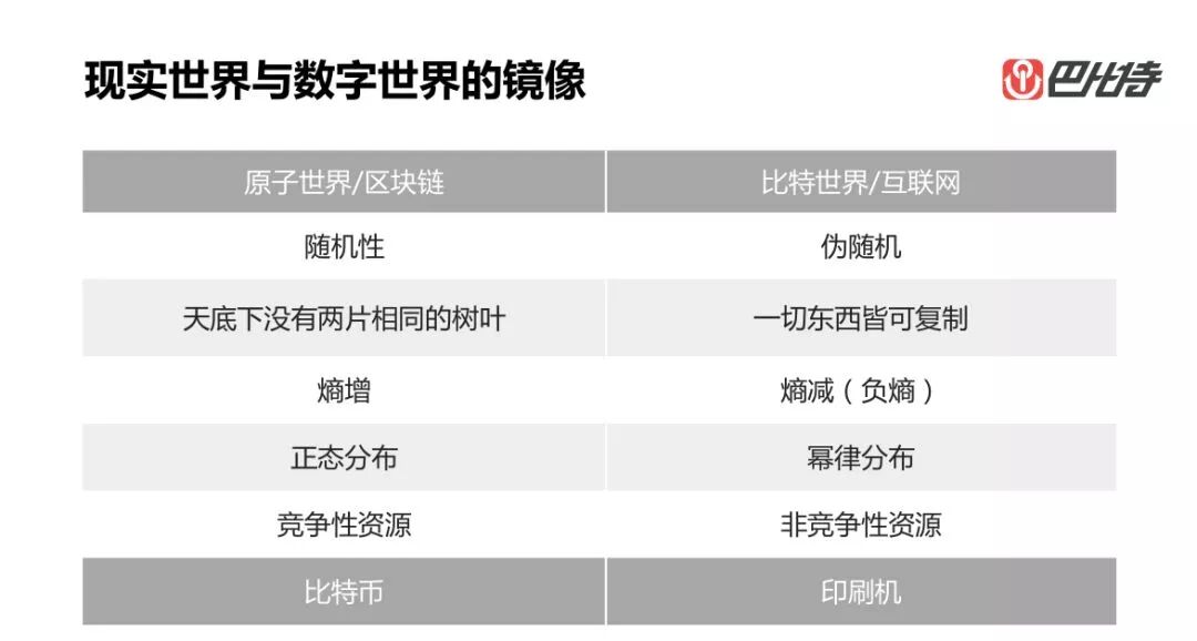这个表格表示现实世界和数字世界其实是呈一种镜像关系,现实世界也可以叫做原子世界,在现实世界中事物都是随机分布,都是随机性,在数字世界上一般东西都是伪随机的,现实世界中天底下没有完全相同的两片树叶,互联网上一切东西都可以复制,在现实世界是正态分布的,在数字世界是幂律分布,是马太效应+长尾效应。在现实世界中事物都是竞争性资源,就是独占性资源,比如一个话筒、一杯水我拥有它,别人就不能拥有它。在数字世界所有的资源都是一种非竞争性的资源。比如一个文档我把这个文章传给了另外一个人,但其实这个文档是不能像现实中一本书转移一样的,因为这个文档有可能在我的电脑或者是其他的存储介质中保存了无穷多个副本,所以基于这样一个镜像关系,我们可以提出这样一个问题,为什么在现实世界中要复制一模一样的东西非常困难,这个问题可以转为你是否可以在现实中制造出完美晶体,你可以制造出完美晶体,其实是可以复制一模一样的东西,但是热力学第三定律告诉我们,你要制造出完美晶体需要毕竟绝对零度,你就要投入巨量的能源消耗,反过来我们通过这种对称思维,可以提出这样一个问题,就是在数字世界就是在互联网上,你要防止一样东西被复制,来实现这种竞争性资源也是非常困难的。要实现这样一个竞争性资源,就需要投入巨量的人员消耗,就是计算。投入的计算力越高,防止双重支付的壁垒就越高,这就是计算的重要性。