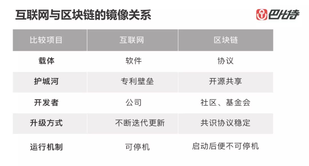 我们再进一步深化一下互联网和区块链的镜像关系。互联网的载体往往是软件,区块链的载体一般都是协议,软件是需要申请专利来建立自己的专利壁垒,区块链相反,大多数区块链项目都是开源,是非常欢迎你拷贝它的代码,不需要建立这种专利的壁垒,不需要护城河。软件的开发主体一般都是公司,区块链的开发主体往往是社区或者是基金会,非常松散的组织形态。软件是需要不断的迭代升级的,协议它的迭代升级却非常困难,所以一般都是非常稳定的,因为协议的升级是需要全网共识的通过,当然这是非常非常困难的。所以才会出现这么多比特币。软件是可以停止维护更新的,协议是启动后便不可停机,24小时不停地运转。基于这样的思维我们可以解决很多心中的疑惑,比如说在10年的时候,当时很多专家或者投资界的大佬认为比特币虽然是个先行者,但是不一定笑到最后,怎么防止被后来者打败,这是一个典型的互联网思维,互联网思维把比特币视为一个软件,通过技术的升级可能后来者居上,就像过去90年代的浏览器,后来早期的浏览器被新来的打败了。但其实比特币不能把它视为一种软件,是一种协议,实现这种区块链的方法已经是一种最小可行的方案,没有太多优化的空间。