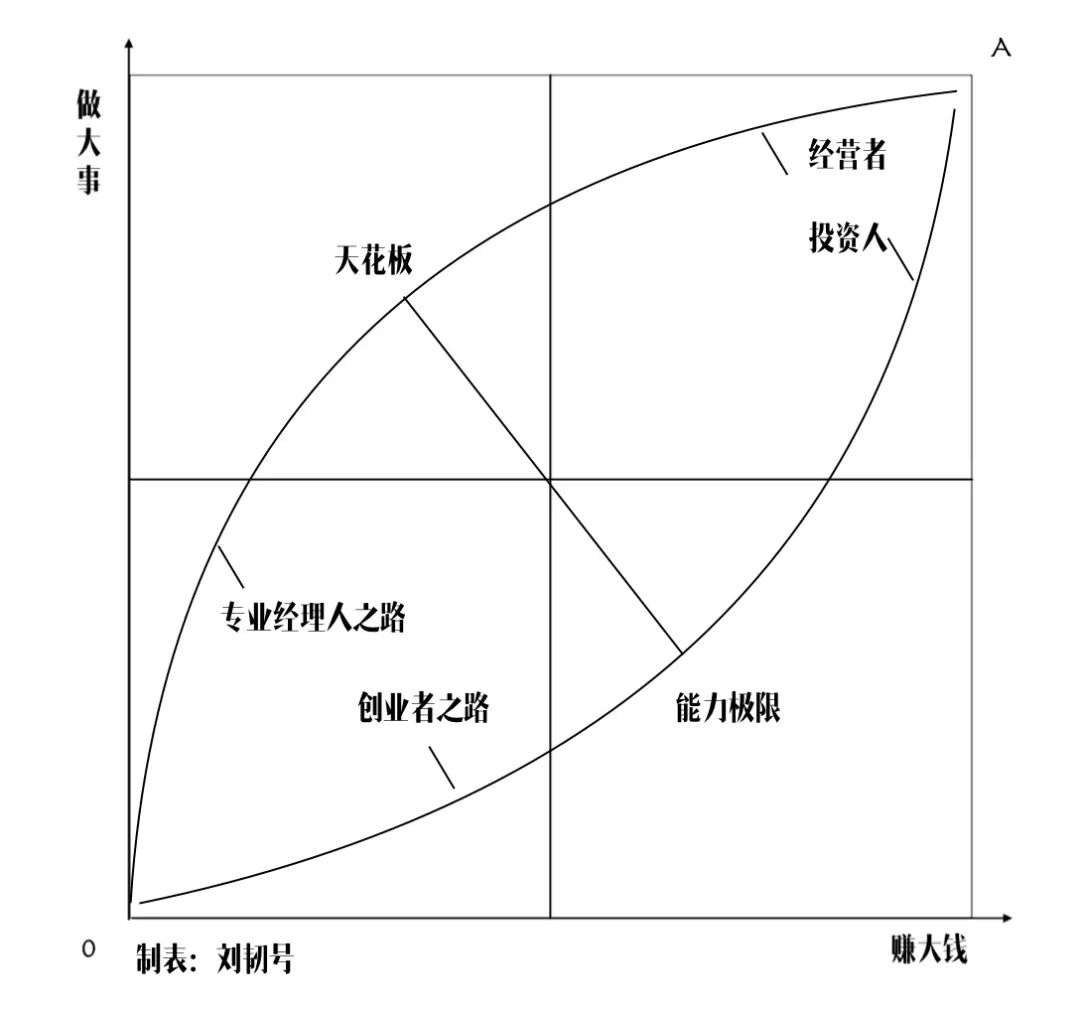 横坐标代表钱越挣越多,纵坐标代表事情越做越大。刚踏入社会的人处在事业坐标的原点O上,事情没做,钱也没有一分。点A代表既挣了大钱又做成大事的完美状态。个人从原点O向目标A的奋斗之路呈两条弧线,上面一条弧线表示,先做大事,继而通过做大事挣大钱的专业经理人之路;下面一条弧线代表,通过挣大钱最后达到做大事的目的。程天纵说,自己选择的是一条专业经理人之路。“这两条路各有各的艰难险阻,很多人只走了一段就永远地停顿了。在专业经理人之路上,你会碰到无法逾越的‘天花板’,它会阻止你做更大的事。创业者之路同样荆棘丛生,像台湾王永庆、施振荣那样的成功者不到万分之一。”