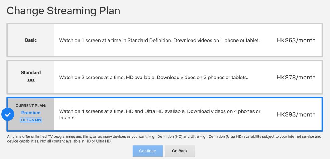 仅有Premium UltraHD才可以享受4K数据流,并且同时允许4个设备在线。也就是说,你可以跟朋友共享账号。