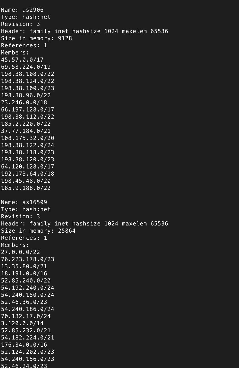用ipset list来查看结果。找到as2906,as14618,as16509这三个ipset就对了。
