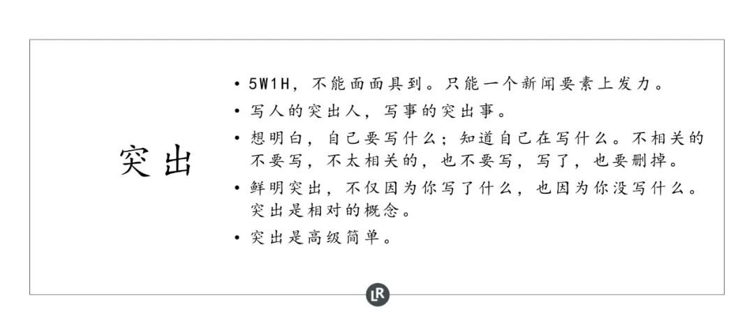 那怎样才能做到突出呢?其实写新闻不能面面具到,抓住一点切进去就行了。新闻的要素无非是五个“W“和一个”H“,一篇好的新闻,只能在一个新闻要素上发力,如果有两个新闻要素要发力,那就在那两个具体新闻要素上发力,没必要面面具到。因为读者在互联网上也不要求你给他一个全面的(消息),读者只会让你给他提供一个他感兴趣的消息,剩下的他可以找别人,可以自己搜索。