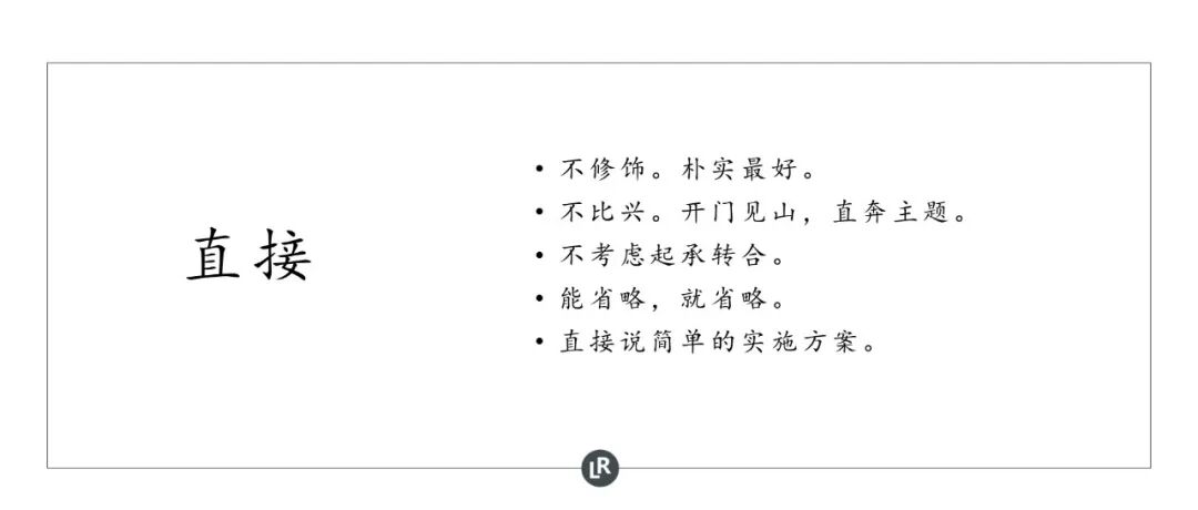 其实直接也是简单的一个实施方案。都说我要做到简单,那怎么样才能做到直接呢?直接就是不修饰,越朴实越好,不去打扮,是什么样就是什么样。开门见山,直奔主题。