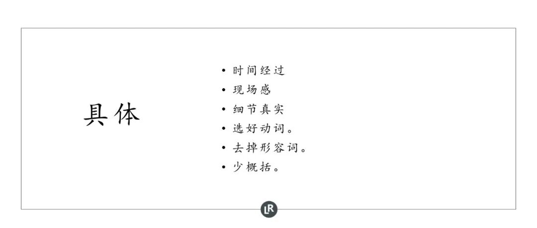 文章如果要讲具体,就要去掉形容词。形容词和副词都是非常不具体的。哪个地方火灾了,“火很大”,到底有多大,其实还是不清楚。“火很大”是非常不好的表达,应该表达为“火焰有多高”。比如说“五米高的火焰”那我马上就能够知道火有多大。