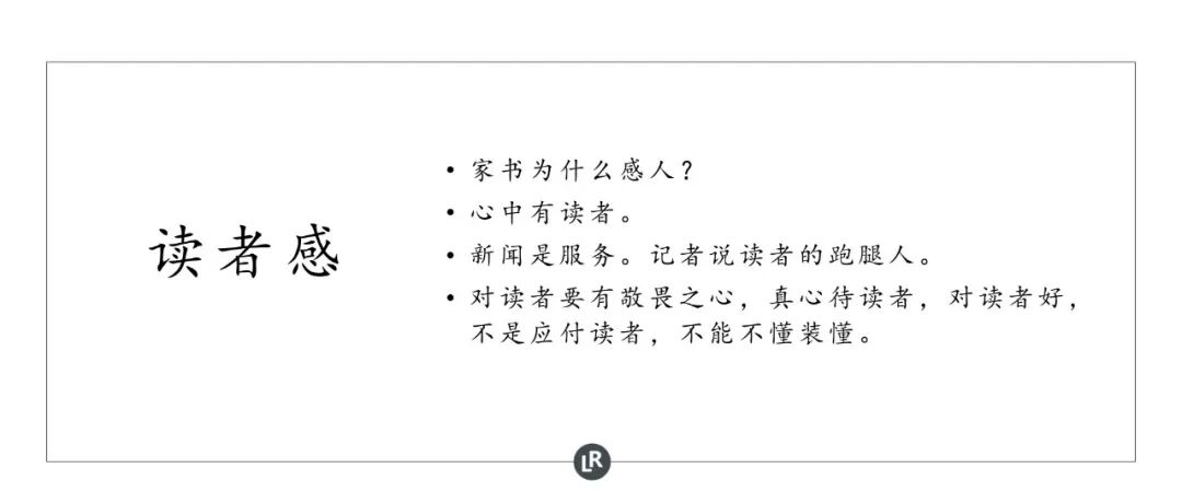 为什么呢?因为首先,家书是有对象的,是写给他爸爸的,写给他老婆的,写给他儿子的。第二,他是有话要说的,有感情要表达的,有事情要交代的。为什么我们的消息写得没人看,因为你不知道写给谁的,写给公关公司的,写给客户的,这当然显得不自然。所以你心中一定要明白,你是写给谁看的。第二点,你是真的没有话要说,还是只是为了凑篇稿子?你要有话要说。我觉得有这两点,你一定能写得很感人。