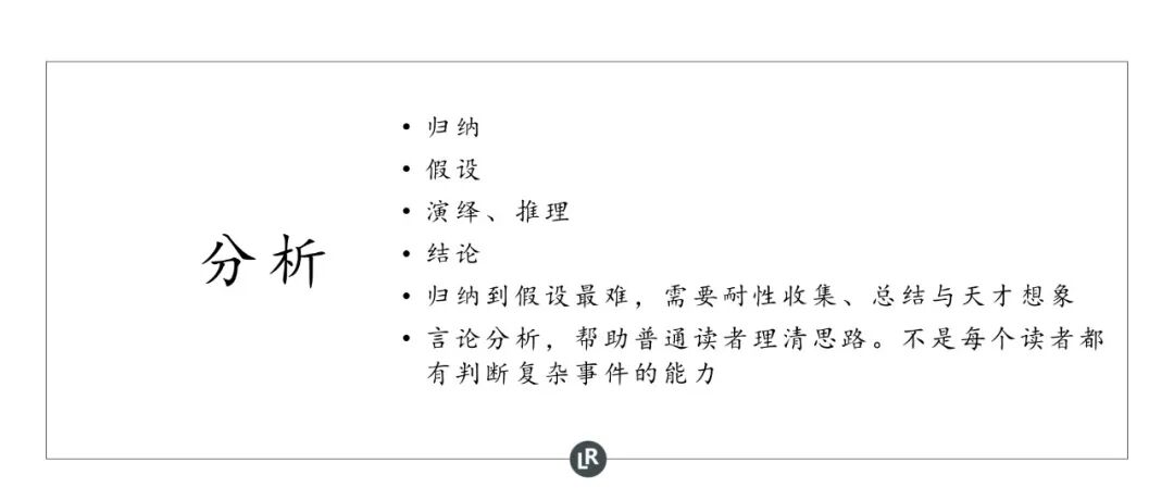 分析主要有几个工具,其中最有用的方法是归纳。归纳是人类很厉害的一种认知能力,很多伟大的发现来自于归纳。比如牛顿发现万有引力,就是看见苹果会从树上掉下来,球扔到空中也会掉下来,所有东西扔到空中都会掉下来,他归纳的结果就是有万有引力。我们很多的认识都来自于归纳,比如说A这个人前年对我不错,去年对我不错,今年也对我不错,什么时候都对我不错,我归纳的结果就是A这个人不错。归纳的方法很多时候都在使用,也是比较可靠的方式。再比如A企业家2001年吹牛,2002吹牛,2004年吹牛,后来又在吹牛要超越乔布斯,那我们就能归纳,这个人是不可靠的。这些都是最简单的思维方式,只要归纳一下,结论就很容易得出了。