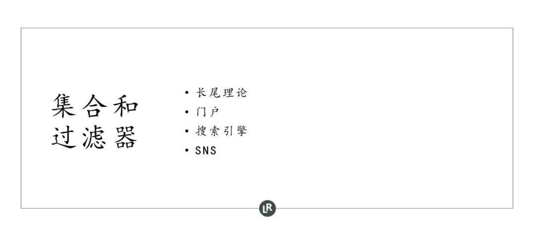 第四种形态是SNS,它是通过朋友过滤。通过朋友的选择,比如朋友写的或者评论过的内容,我信任朋友感兴趣的东西所以去看,它是通过人来进行过滤。过滤器其实是一个制高点,集合器也是一个制高点。但是过滤器小公司是可以做,而集合器小公司做不了。