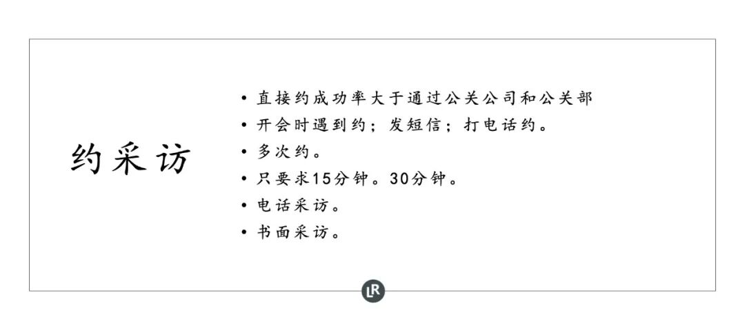 怎样才能约到采访对象呢?首先要直接。如果只是通过该家公司公关部约,那么被拒绝的可能性非常大。在联系公关部同时,记者也要亲自去联系。联系的方式很多,和被采访对象开会的时候当面约,有电话号码的,打电话约,一次约不到,两次去约,长时间采访约不到就约短时间,15分钟,3分钟都可以。但是双方一旦坐下来,你就可以赖着不走,就此采访下去,不会是只有15分钟,这些都是经验。新闻最重要是第一手资料,为了第一手资料要不惜一切。如果遇见不想见面的受访者,电话采访也行,再不济书面采访也是可以。