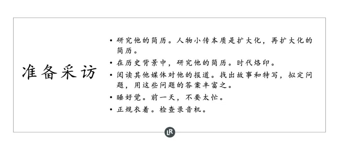 人物专访的准备,最重要的是研究受访者简历。了解一个人,最好的方式就是看他简历,写人物专访本质上,就是将受访者简历给扩大化、故事化。做到这一步后,还要将个人小故事,放进大历史的背景中。