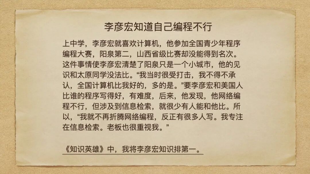 别人问我,中国IT界谁的知识最丰富?我会毫不犹豫说是李彦宏,李彦宏什么都知道。有一年,华为和思科打知识产权官司,李彦宏跟我讲了非常多关于知识产权的知识。什么叫流氓知识产权,什么叫保护性知识产权。2003年左右,我想炒美股,李彦宏劝我不要炒,他说炒股顶多可以算是可推测的赌博。有一回,他买一支股票,在电话里委托交易,把股票代码说错了,但结果反而赚到了钱。李彦宏读书时,在山西计算机比赛里,连个名次都没得到。去美国后,他知道自己编程不行,第一份工作,选了《华尔街日报》的网站,做了不那么受重视的技术岗位。