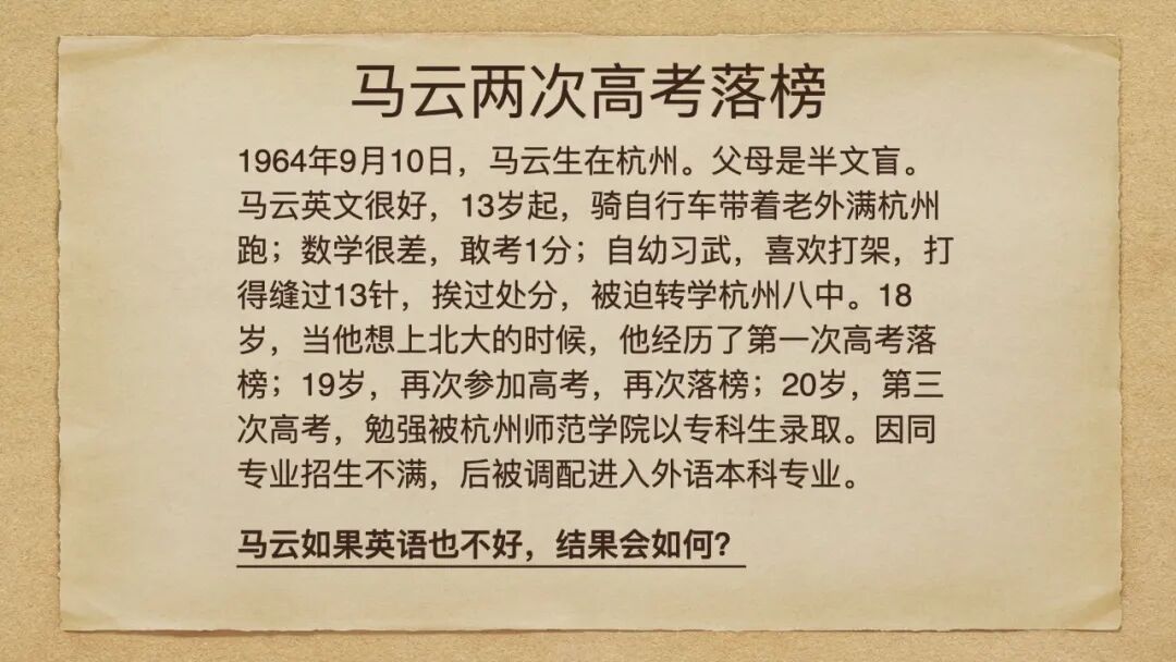 大家都知道,前几天阿里巴巴上市,市值超过了英特尔,和Facebook差不多,是纳斯达克前10的公司。仅从学历看,马云18岁高考落榜,19岁高考再次落榜,20岁勉强考上一个专科。有人说,马云至少英文好。但如果马云英文也不好,马云就没今天吗?马云英文确实好,因为英文好,马云做出第一个创业项目,一个翻译社,组织英文好的人,给人做翻译。马云第二次创业,做网上黄页。第三次创业,是想投奔商务部下面的一家公司,融到国企里面。阿里巴巴是马云的第四次创业。如果马云只是英文好,他最可能在杭州办一个更大点的翻译社,但他很快就放弃了,他做网上黄页之后,把翻译社送给他的老师。