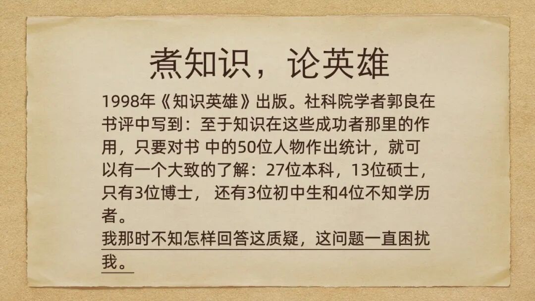 1998年,我写成《知识英雄》,好友郭良为我写书评发表在《中华读书报》,标题叫《煮知识论英雄》,他在书评里问我,书里50个人物,只有3位博士,13个硕士,27个本科,还有3位初中生和4位不知学历者,这些人囊括了当时中关村最成功的50个人,但从统计数字看,这些人的知识并不太多。他问:真的是知识成就英雄吗?当时我不知道怎么回答他。我只是对他笑笑,然后就没吭声了。十多年过去,我觉得今天差不多能回答这个问题。