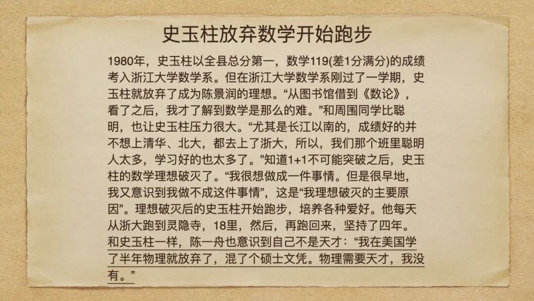 史玉柱是我安徽老乡,从高考分看,史玉柱是全县总分第一,肯定是个好学生。我2006年采访他,他告诉我,一开始他以为自己数学特别好,当年高考数学差1分满分,但他进了浙江大学以后,很快就发现自己不是学数学的料,他发现,班上比他聪明的同学一大把。我问:怎么办?他说:我也不知道该怎么办,不知道自己未来该干什么。所以,我每天去跑步,培养各种爱好。他每天从浙大跑到灵隐寺,然后再跑回来,来回18公里,坚持了4年。史玉柱的故事提醒我,我们从书本上学到的知识,真的和未来创业有关系吗?这是个问题。